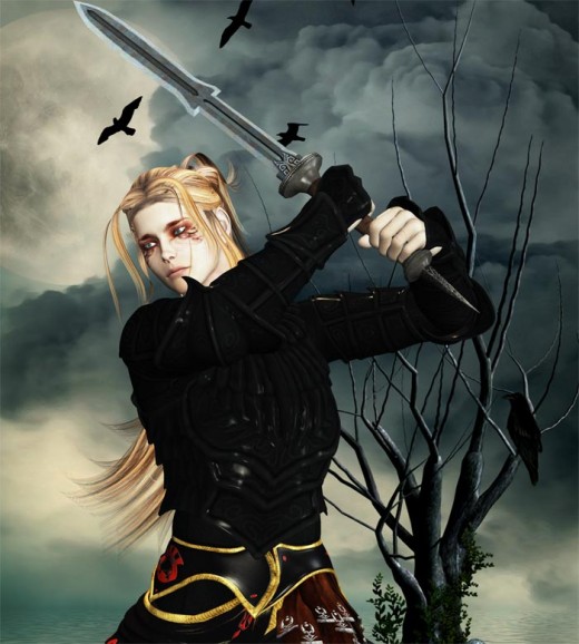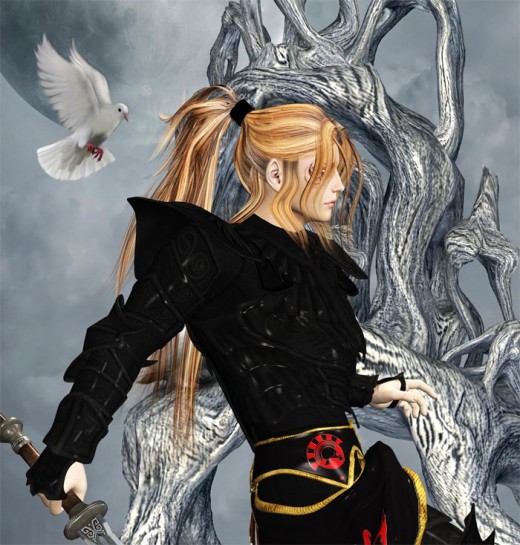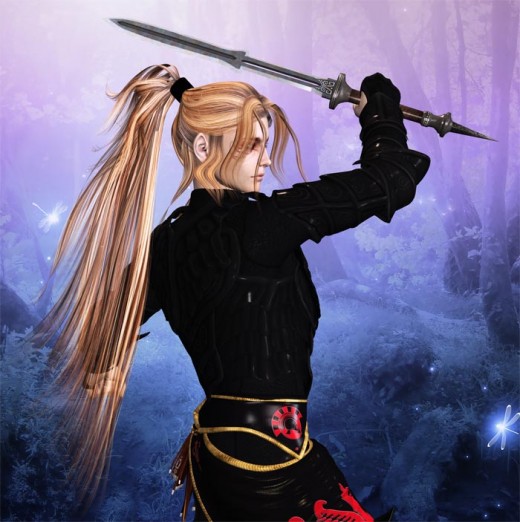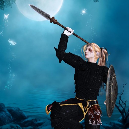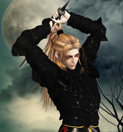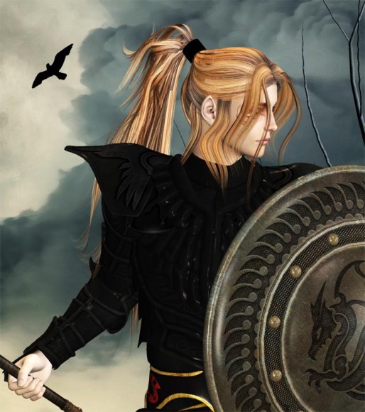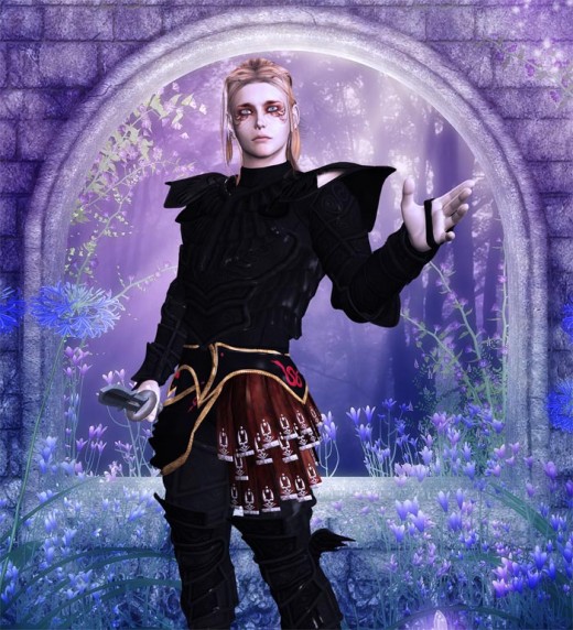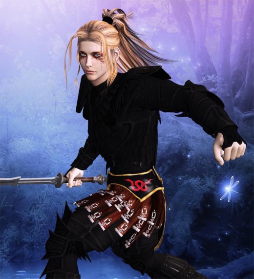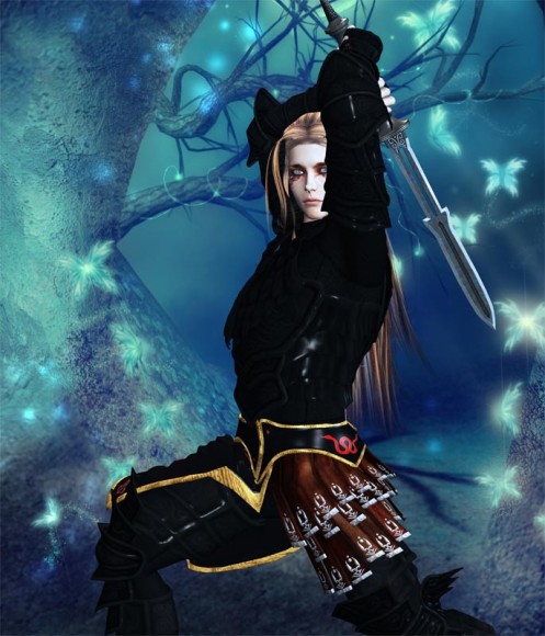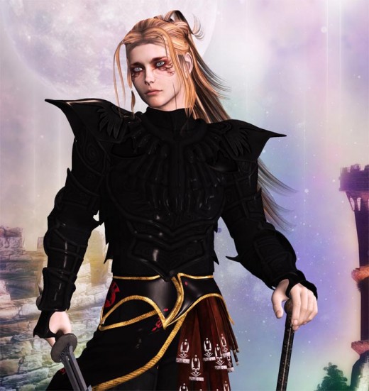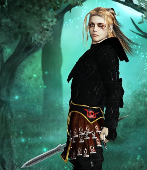 In addition, my elf knight has long blonde hair, tied in the style of a warrior. He wears jet-black armor which contrasts well with his light skin and hair color. Also note the warrior tattoos on his face.