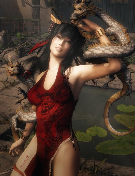 In the Dragon Girl scene below, I changed the material of the two dragons to metal, I also changed the trim of her dress to metal, and I changed the pond at her back to water. I needed to do some test renders to set the visibility of the water to something that looked good in the scene, but that was very doable and the results are well worth it.
