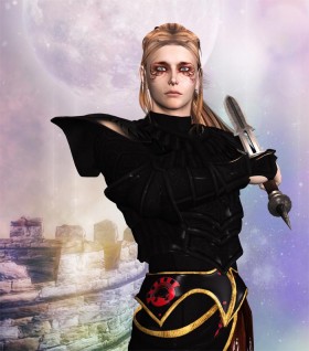 Elves have long life, enhanced senses, an affinity with nature, and an ethereal beauty. These elf knight pictures feature a handsome elf, with long blonde hair, and jet-black armor. He wields various weapons and a shield.