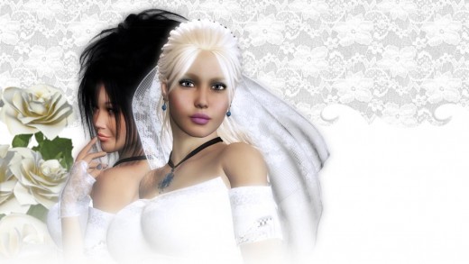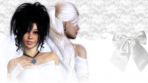 This wedding theme focuses on the bride and bridal gown. I decided to feature both a dark haired and light haired bride to show the contrast with the white wedding gown. Both brides are wearing blue jewelry, with some light makeup.